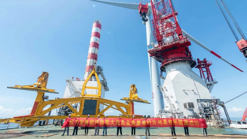 近日,汕頭某海域,巨力索具研發(fā)的國(guó)內(nèi)首臺(tái)50噸大兆瓦全角度旋轉(zhuǎn)式海上單葉片吊具,剛剛面世,便展開(kāi)連續(xù)作業(yè),順利完成5臺(tái)風(fēng)機(jī)的葉片吊裝,經(jīng)受住了考驗(yàn),完美的展示了巨力吊具的高可靠性、高安全性及高效率。