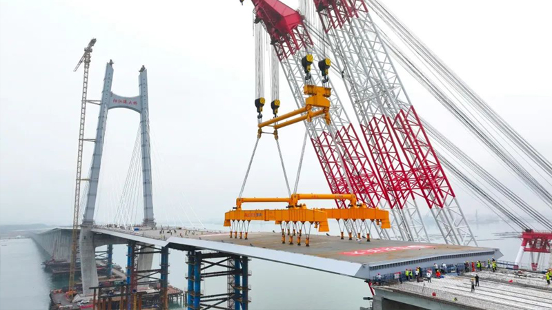 3月30日上午10時(shí)02分 隨著最后一塊鋼箱梁成功吊裝到位 陽江港大橋順利合龍 如一條巨龍橫臥海面 標(biāo)志著廣東省濱海公路 海陵大堤段至溪頭段實(shí)現(xiàn)全線貫通 向通車目標(biāo)邁出了重要一步! 陽江港大橋全長(zhǎng)4777.2米 是廣東濱海旅游公路陽江海陵大堤 至溪頭段公路項(xiàng)目的控制性工程 由保利長(zhǎng)大工程有限公司承建 巨力索具負(fù)責(zé)該項(xiàng)目鋼箱梁吊具制作 鋼箱梁采用大節(jié)段吊裝方案,分6個(gè)節(jié)段 最大梁段長(zhǎng)90米,最小梁段長(zhǎng)74.5米