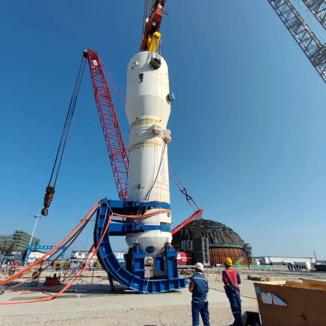 2022年8月,“華龍一號”漳州核電2號機組穩(wěn)壓器通過“主設(shè)備預引入法”順利吊裝就位,巨力索具通過項目現(xiàn)場移動式翻轉(zhuǎn)支座、翻轉(zhuǎn)抱環(huán)、拉緊裝置,提供吊桿及吊梁等翻轉(zhuǎn)吊裝產(chǎn)品,使用3200t吊車在反應(yīng)堆廠房外翻轉(zhuǎn)、吊裝引入至穩(wěn)壓器間,全程保障項目吊裝順利進行。