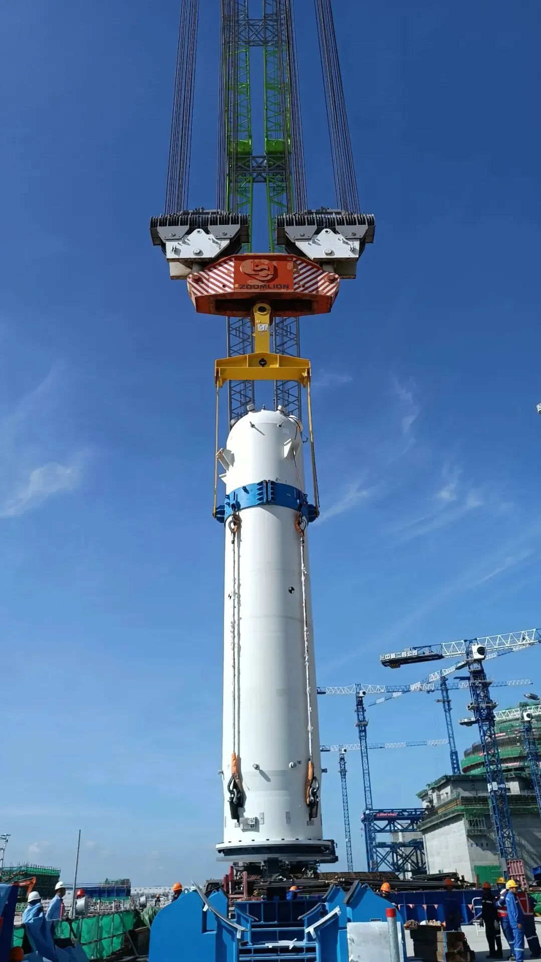 2021年10月,漳州核電1號機組反應(yīng)堆壓力容器吊裝成功,吊裝過程翻轉(zhuǎn)、吊裝、就位難度極大,巨力索具項目團隊聯(lián)合各部門共同確定最終吊裝方案,順利完成吊裝,吊裝過程中所用的吊具均由巨力索具提供。