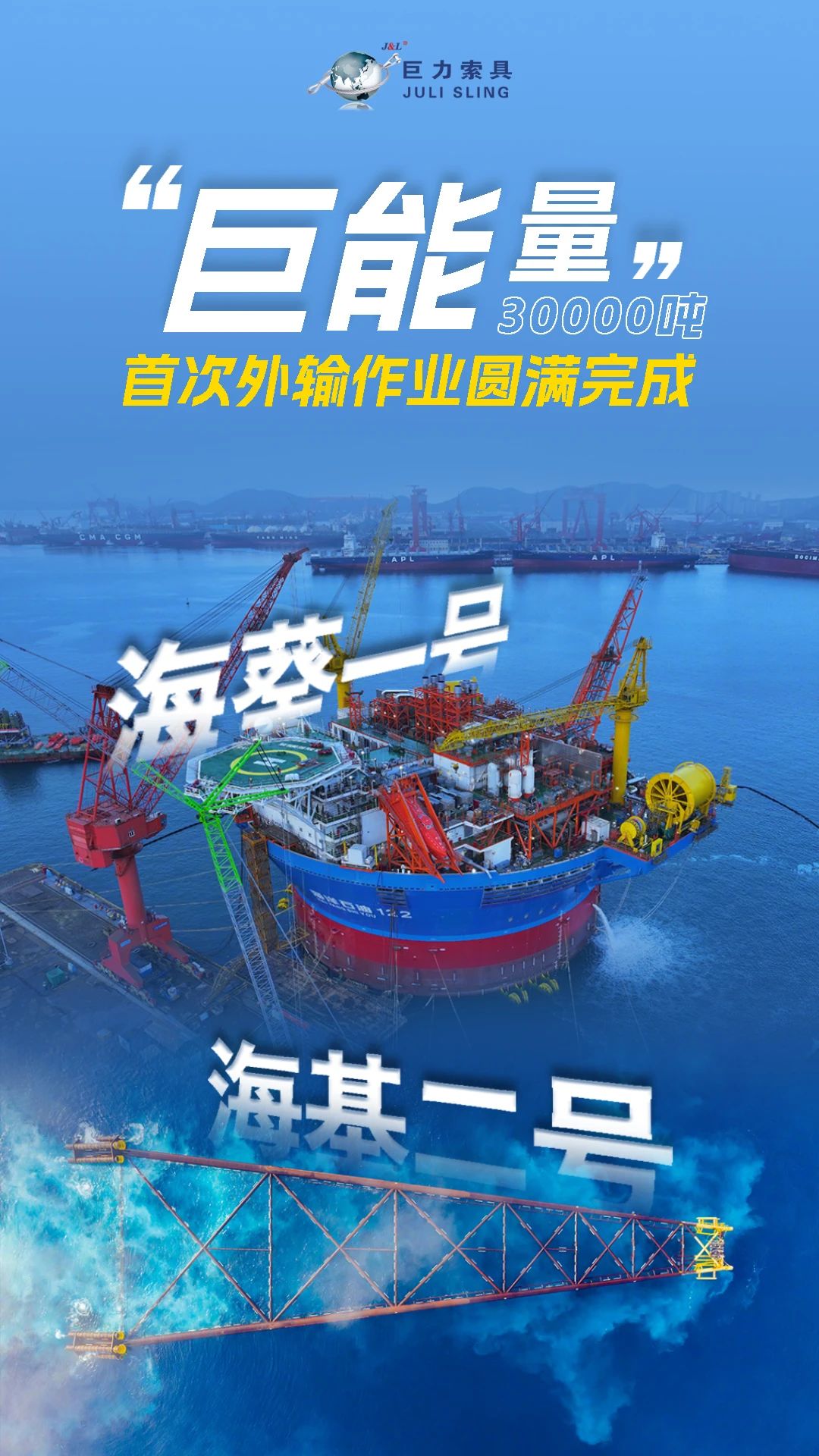 同時(shí),巨力索具承擔(dān)了“?;枴钡牡跹b工作。2024年3月,“?;枴弊鳛閬喼薜谝簧钏畬?dǎo)管架,是亞洲高度最高、重量最大的導(dǎo)管架。巨力索具通過環(huán)形無接頭繩圈等高性能產(chǎn)品,確保了導(dǎo)管架在深海中的穩(wěn)定和安全,創(chuàng)造了固定式海洋平臺重量、高度、作業(yè)深度等多項(xiàng)亞洲紀(jì)錄。