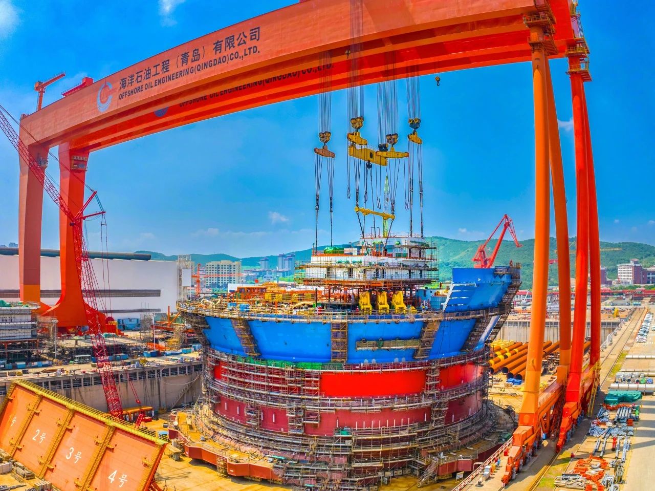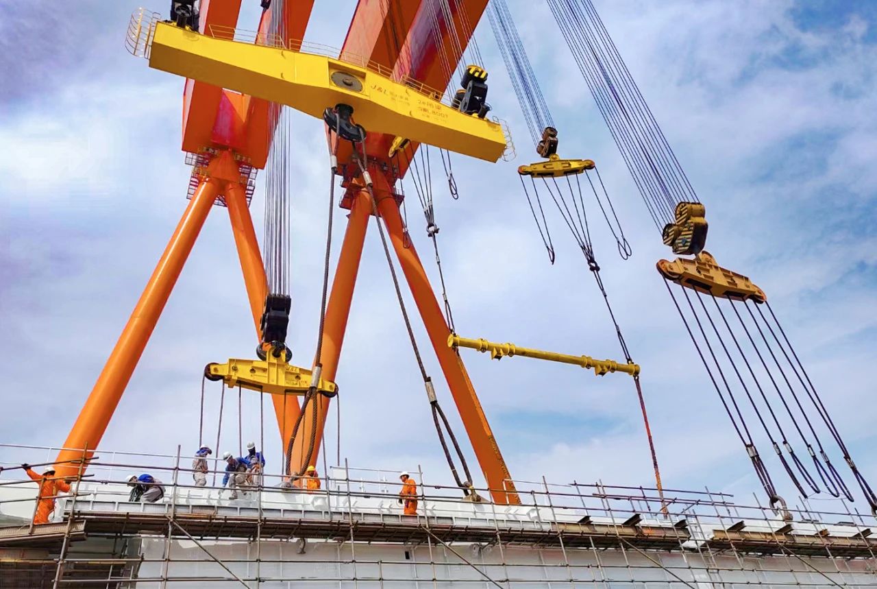 2023年12月,由我國自主設(shè)計(jì)建造的亞洲首艘圓筒型“海上油氣加工廠”“海洋石油122”浮式生產(chǎn)儲卸油裝置——“??惶枴背壞茉赐朐谇鄭u完成主體建造,巨力索具提供800噸吊梁、400噸、500噸吊排及配套索具組成成套吊裝系統(tǒng),全程配合吊裝順利進(jìn)行。