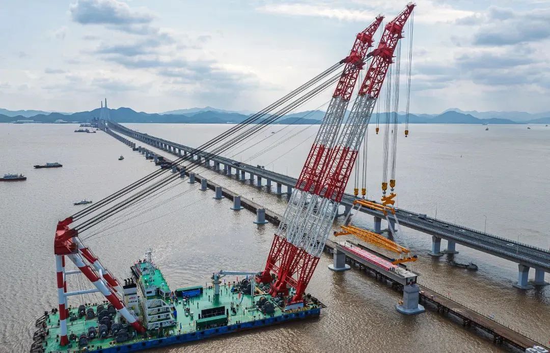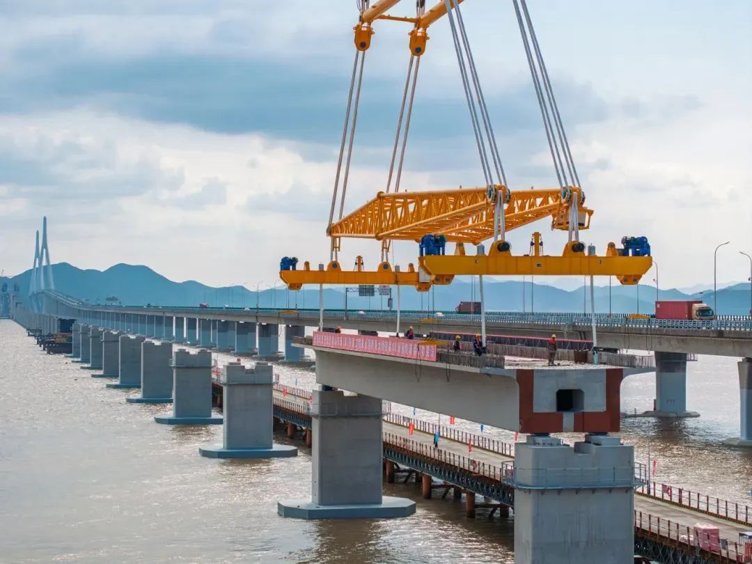 11月5日,隨著現(xiàn)場指揮一聲令下,國內(nèi)首座市域(郊)鐵路跨海大橋,重1700噸的預(yù)制箱梁穩(wěn)穩(wěn)落至橋墩上,巨力索具箱梁吊具全程保障首榀箱梁成功架設(shè),標(biāo)志著大橋全面進入上部結(jié)構(gòu)施工階段。