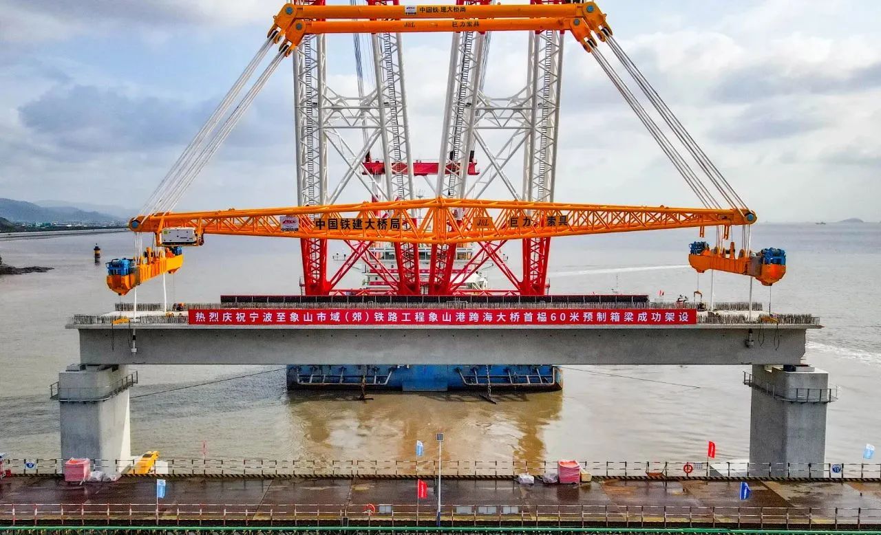 大橋海上架設(shè)預(yù)制箱梁共66榀,每榀梁長60米,寬10.6米,重約1700噸,吊具重280噸,總體起吊總重1980噸,是國內(nèi)市域(郊)鐵路工程跨度最大、噸位最重的預(yù)應(yīng)力混凝土預(yù)制箱梁。