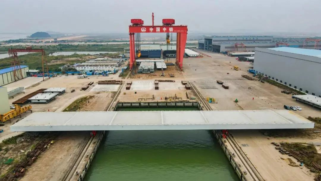 深中通道G05標(biāo)段泄洪區(qū)及淺灘區(qū)鋼箱梁大節(jié)段XG9L的出海平臺方案為世界首創(chuàng)的出海運輸方案,整個運輸過程使用8臺模塊車,4臺移梁平車,頂升運載能力可達2000噸。經(jīng)過三次頂升及運輸,將鋼箱梁大節(jié)段XG9L從存梁區(qū)運至待裝船區(qū),由世界第二起重能力的“天一號”運架一體船將鋼箱梁吊運至橋址。