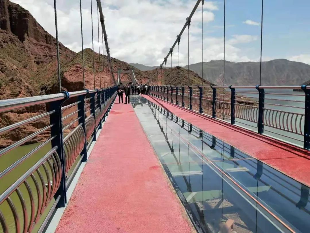 青??膊祭皡^(qū)人行懸索橋全程跨度110米,橋梁寬6米,人行道凈寬5米。大橋位于李家峽水庫入口附近,橋梁連接水庫入口兩岸,兩端連接旅游人行棧道,坎布拉丹霞地貌多以奇峰、峭壁為其主要地貌特征,生態(tài)環(huán)境脆弱,大橋兩岸地勢陡峭,工程地質(zhì)條件極為復(fù)雜,對產(chǎn)品要求極高。
