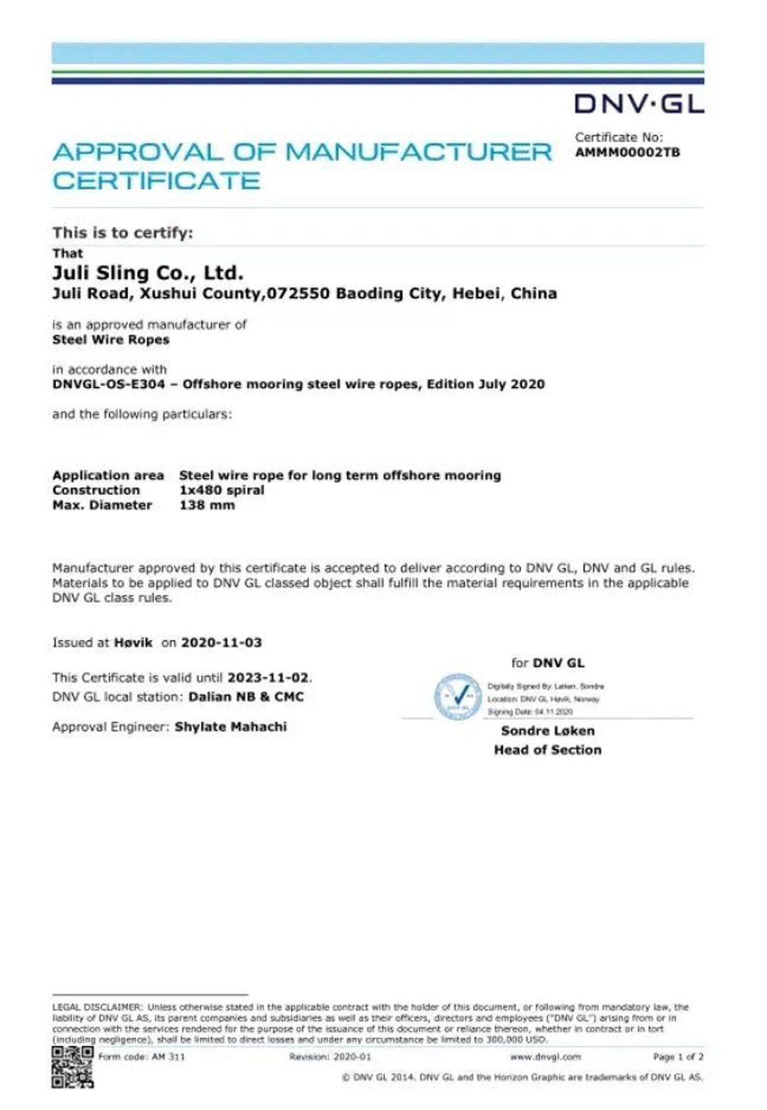 同時(shí),巨力索具系泊產(chǎn)品通過(guò)了DNV·GL工廠認(rèn)證成為國(guó)內(nèi)首家通過(guò)該類鋼絲繩DNV·GL工廠認(rèn)可的廠家。系泊索各項(xiàng)指標(biāo)達(dá)到了國(guó)際先進(jìn)水平,標(biāo)志著我國(guó)浮式海上風(fēng)電永久系泊關(guān)鍵裝備的研發(fā)設(shè)計(jì)、生產(chǎn)制造以及國(guó)產(chǎn)化上實(shí)現(xiàn)了新突破,為我國(guó)深遠(yuǎn)海浮式風(fēng)電商業(yè)化發(fā)展以及關(guān)鍵技術(shù)及裝備國(guó)產(chǎn)化奠定了堅(jiān)實(shí)基礎(chǔ)。