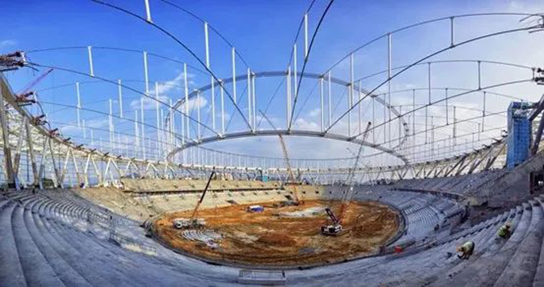 該體育場(chǎng)整體外輪廓平面投影為不規(guī)則的倒角五邊形,其外輪廓南北最大長(zhǎng)度約305米,東西約270米,罩棚最高點(diǎn)標(biāo)高約46米。從體育場(chǎng)內(nèi)的觀眾席處仰望,一根根鋼索交織連接,各自用力拉伸,巨大鋼網(wǎng)架躍然呈現(xiàn),好似一座兼具了力學(xué)、美學(xué)、科技的藝術(shù)品。