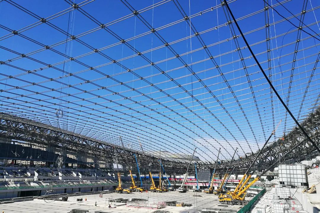 盧塞爾體育場是2022卡塔爾世界杯主體育場,最多可容納92000人。該體育場外形以阿拉伯椰棗碗和琺瑯燈籠為設(shè)計(jì)靈感,屋頂為雙曲面構(gòu)造,造型呈馬鞍形,東西高,南北低,整個(gè)體育場投影為圓形。屋面主索網(wǎng)采用魚腹式索網(wǎng)結(jié)構(gòu),跨度達(dá)到274米,最大懸挑距離為76米,該結(jié)構(gòu)形式為首次應(yīng)用,無論是對(duì)產(chǎn)品的制造,還是施工安裝都具有極大的挑戰(zhàn)。因此盧賽爾體育場也成為了全球最大跨度雙層交叉索網(wǎng)屋面單體結(jié)構(gòu)。同時(shí)也是設(shè)計(jì)標(biāo)準(zhǔn)最高的索網(wǎng)屋面單體建筑。整個(gè)索網(wǎng)結(jié)構(gòu)從產(chǎn)品原材料到成品制造以及施工安裝均超過了歐美標(biāo)準(zhǔn)要求,巨力索具憑借過硬的實(shí)力成為一級(jí)專業(yè)分包,負(fù)責(zé)執(zhí)行整個(gè)屋頂索膜結(jié)構(gòu)體系的設(shè)計(jì)、供貨、安裝總承包工作。