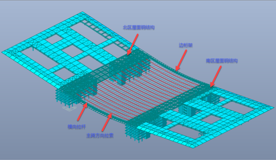 就拿高難度的拉索安裝來說,矢高約3.5米的超大弧形懸索鋼屋蓋,每榀桁架起吊后,需要找到最適宜的角度做成傾斜狀態(tài)。其中最長的桁架,連續(xù)跨度可達(dá)120米左右。大屋面由“雙向鋼桁架+跨中拉索結(jié)構(gòu)”組成,中央?yún)^(qū)域110米全懸空的懸鏈態(tài)由兩側(cè)邊桁架及中間36根直徑為70毫米的不銹鋼拉索組成,施工牽引張拉、精度、溫度、雙索的扭曲偏轉(zhuǎn)是無可回避的難題。