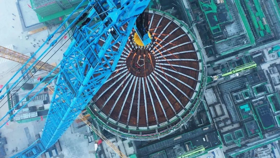 吊裝過程中,穹頂宛如一個(gè)巨型“帽子”,它是保證反應(yīng)堆廠房安全殼完整性和密封性的重要組成部分。據(jù)了解,本次穹頂?shù)跹b呈現(xiàn)整體吊、物項(xiàng)多、總重大、精度高等特點(diǎn),包含鋼襯里結(jié)構(gòu)以及支撐籠架、部分鋼筋和預(yù)應(yīng)力導(dǎo)管、全部貫穿件、加強(qiáng)板、內(nèi)部鋼結(jié)構(gòu)、設(shè)備支吊架、噴淋系統(tǒng)、照明系統(tǒng)、消氫裝置、換熱器設(shè)備、探測設(shè)備等設(shè)備,總重量為739.016噸。